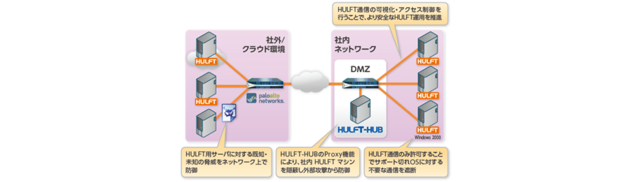 このたびHULFT事業部では、幕張メッセで開催される、最先端ITテクノロジーイベント「Interop Tokyo 2014」内、パロアルトネットワークス合同会社様のブースに出展いたします。当社出展小間では、パロアルトネットワークス合同会社様の次世代ファイアウォールPAシリーズとの連携ソリューションを展示いたします。HULFT転送をPAシリーズ側で可視化し、HULFT-HUBを使って制御することで、よりセキュリティの強固なファイル転送基盤を構築できます。