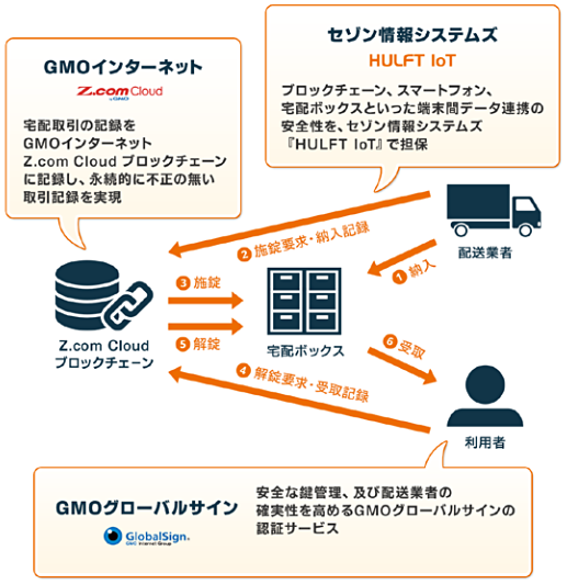 今回のシステムは、GMOインターネットが提供するPaaS型のブロックチェーンプラットフォーム「Z.com Cloud ブロックチェーン」を基盤に構築し、IoTデバイスである宅配ボックスにはセゾン情報システムズが提供する安全・確実なシステム間連携を実現する信頼性の高い「HULFT IoT」を導入いたしました。このシステムでは、配送業者が宅配ボックスに荷物を納入することで、ブロックチェーン上に納入記録および施錠要求が行われます。荷物を受け取る利用者は、個人に紐づくスマートフォンを通じてブロックチェーン上に解錠を要求することで、宅配ボックスが解錠し、荷物の受領が記録されます。