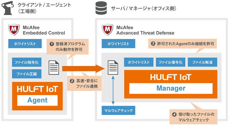 IoTデバイス側にインストールする「McAfee Embedded Control」は、ホワイトリストに基づいたプログラムの監視を行ない、未承認プログラムからデバイスを保護します。このリストに登録済みの「HULFT IoT」Agentは、IoTデバイスが生成したファイルの圧縮と独自の暗号化を行ない、通信時の情報漏えいを防ぎながら、サーバ側の「HULFT IoT」Managerに連携します。
