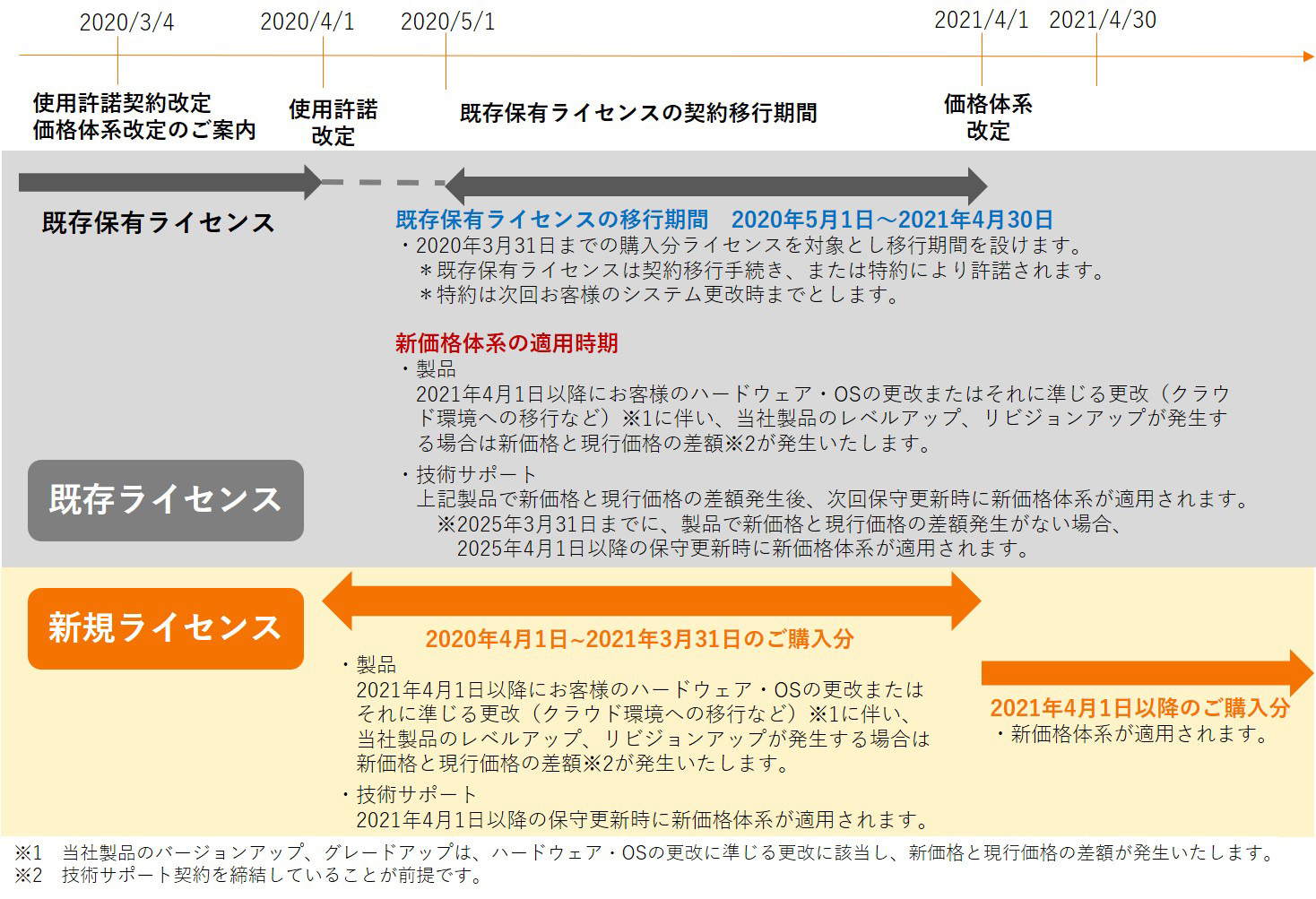 2021年4月1日以降にお客様のハードウェア・OSの更改またはそれに準じる更改(クラウド環境への移行など)※1に伴い、当社製品のレベルアップ、リビジョンアップが発生する場合は新価格と現行価格の差額※2が発生いたします。