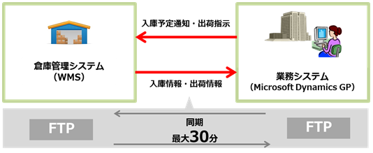 FTPによるファイル転送ではポーリングの待ち時間が重なってしまうと、場合によっては1回のデータ転送に30分程度もかかってしまうことがあり、入庫・出荷指示が完了するまでにタイムラグが発生して、スムーズに業務が遂行できないという問題がありました。