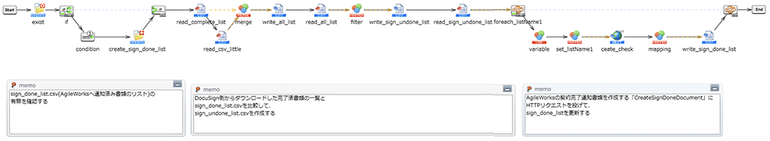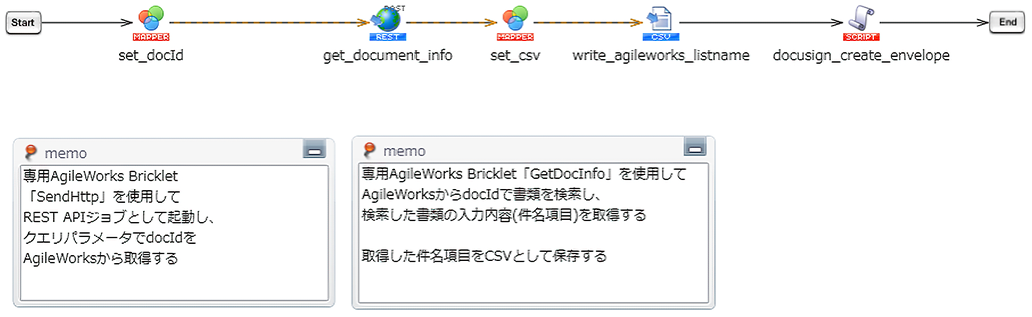 - DocuSign eSignatureから署名済みになった契約情報を取得し、AgileWorksで契約完了フローを申請する処理