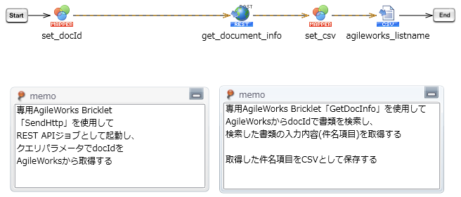 ※1 前提として、HULFT SquareからHTTPリクエストを受けてAgileWorks内の書類を検索し入力内容(件名項目)をレスポンスとして返すBrickletプログラムの作成が必要です。別紙「HULFT Square連携用Bricklet仕様書」の「GetDocInfo」を参考にしてください