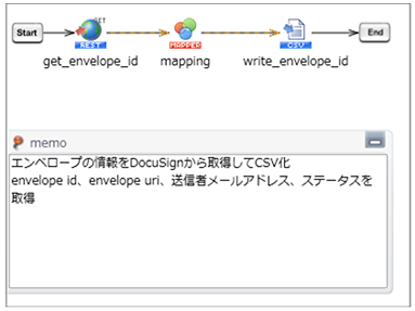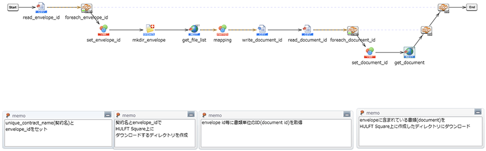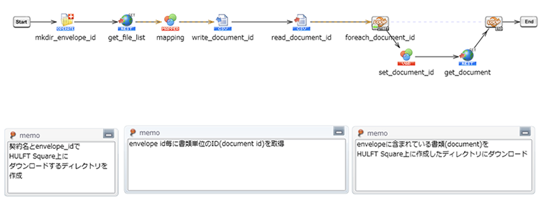 [署名済み契約書リストの取得スクリプト(docusign_get_envelope_id)] で出力した署名済み契約書一覧(CSVファイル)を読み込み、すべてのEnvelopeの契約書ファイルを全件ダウンロードします。ダウンロードしたファイルはHULFT Squareストレージのディレクトリに保存されます。