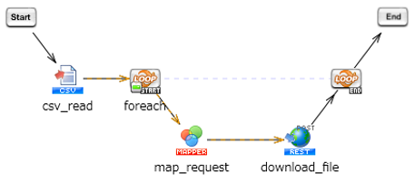 ファイル情報が格納されたCSVファイルを元に、Dr.Sum CloudのファイルをHULFT Squareのストレージにダウンロードします。