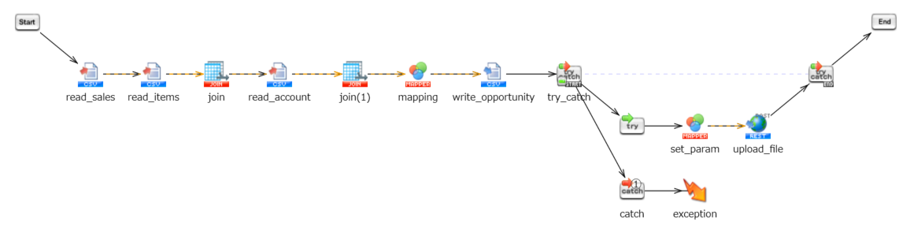 案件情報CSVファイルと商品情報マスタCSVファイルを商品コードで内部結合した上で、取引先情報CSVファイルとアカウントIDで内部結合しアップロード用の案件情報CSVファイルを作成します。案件情報CSVファイルをMotionBoard Cloudに共有CSVファイルとしてアップロードします。
