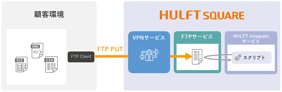 FTPサービスを利用することで、HULFT Squareプラットフォーム上にFTPサーバーを稼働させ、クライアント環境からHULFT SquareへFTP通信でファイルを送信できるようになります。