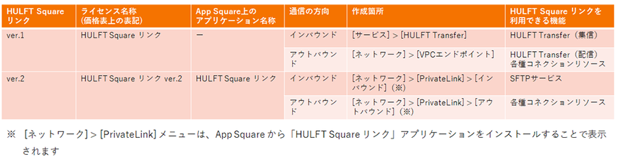 従来より提供していた「HULFT Square リンク」(ver.1)と「HULFT Square リンク ver.2」は、利用できる機能や必要なライセンスなどが異なります。詳しくは下表およびドキュメントをご参照ください。
