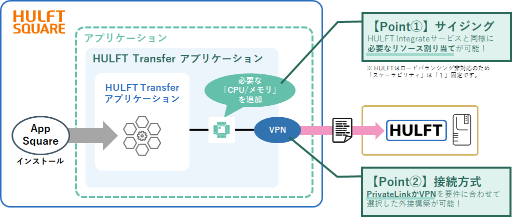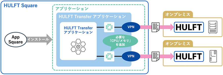 FTPサービスとVPNサービスは、HULFT Squareアプリケーションストア「App Square」で提供されます。お客様はApp Squareより自身の環境にサービスをインストールし、契約のリソース範囲の中からCPUとメモリーを割り当てて実行できます。