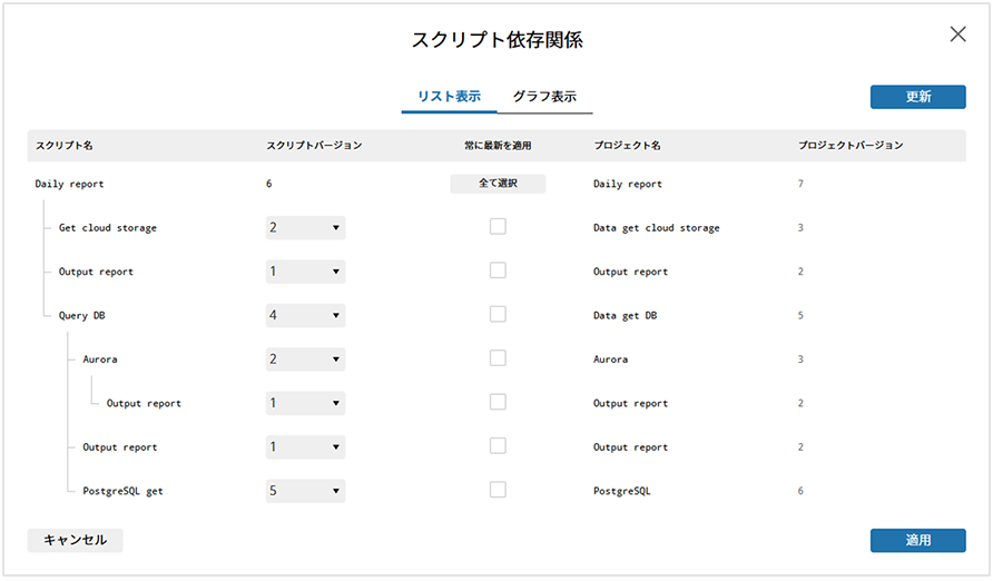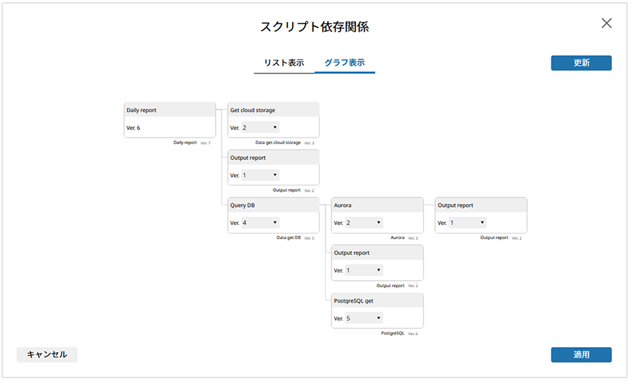 そこで、スクリプト呼び出し機能で呼び出している子スクリプトの依存関係をグラフィカルに表示する機能を追加しました。また本機能では、バージョンの指定を一括で修正したり、常に最新バージョンを適用するといった設定も可能です。
