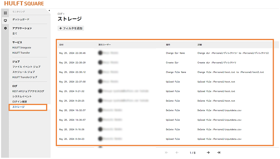 HULFT Squareサイトでユーザーが行った変更のログを確認できます。