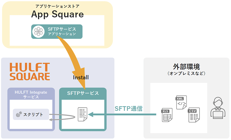 SFTPサービスを使用することで、お客様は外部からHULFT Squareへのファイル転送をSFTP通信で受信できるようになります。受信したファイルはHULFT Squareストレージに格納されるため、ファイルイベントジョブを用いてファイル受信をトリガーとするスクリプトを実行することもできます。