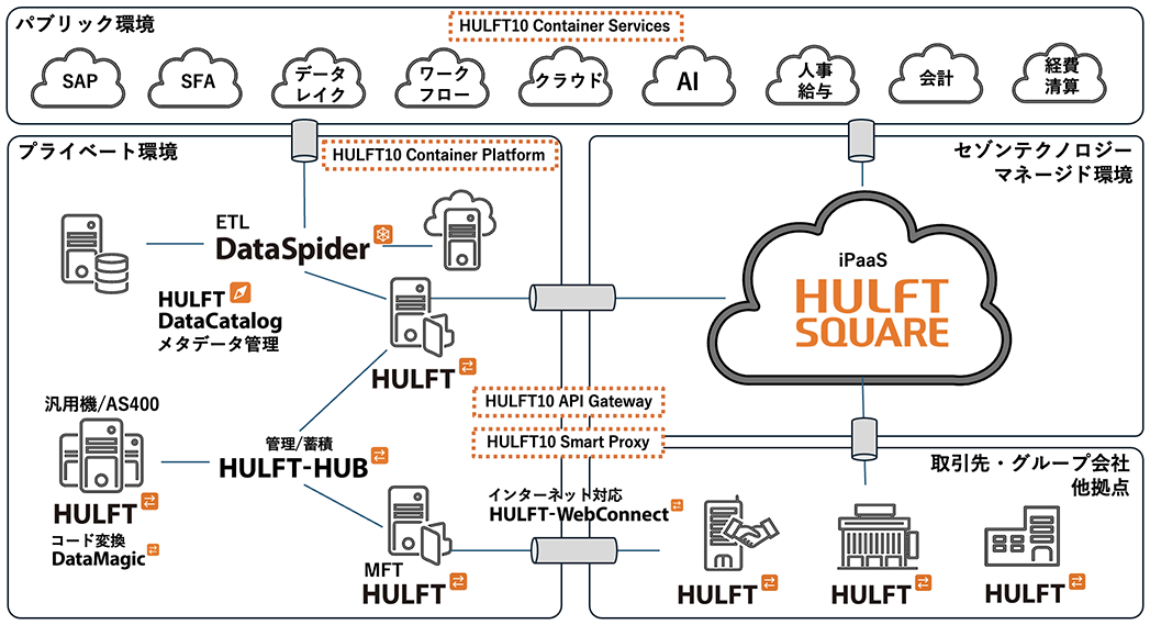 ファイル連携ミドルウェアのHULFTを中心として、お客様環境のOSやデータ形式、プロトコル、システム基盤の違いを超えて企業内外に散在する様々なシステムをつなぐソリューションをご提供いたします。