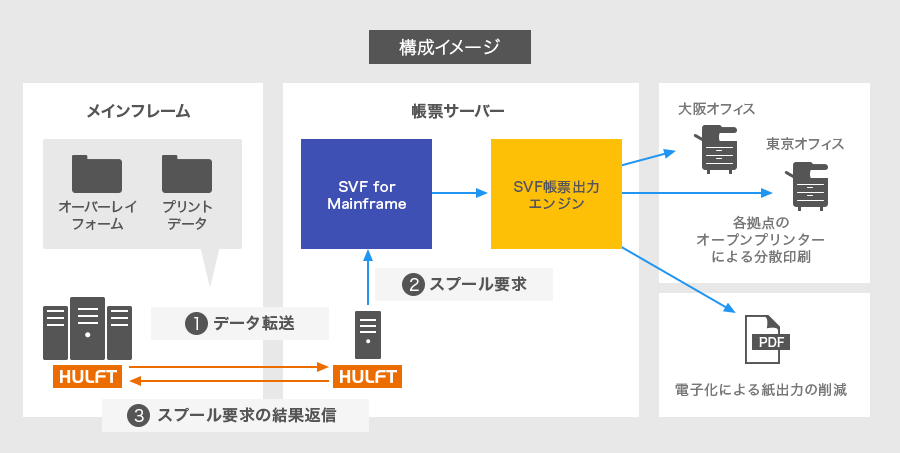 メインフレーム対応の帳票出力ソリューション「SVF for Mainframe」とファイル転送ツール「HULFT」を組み合わせることで、メインフレーム側の変更・開発コストを最小限にとどめながら、帳票出力環境をオープン化することができます。