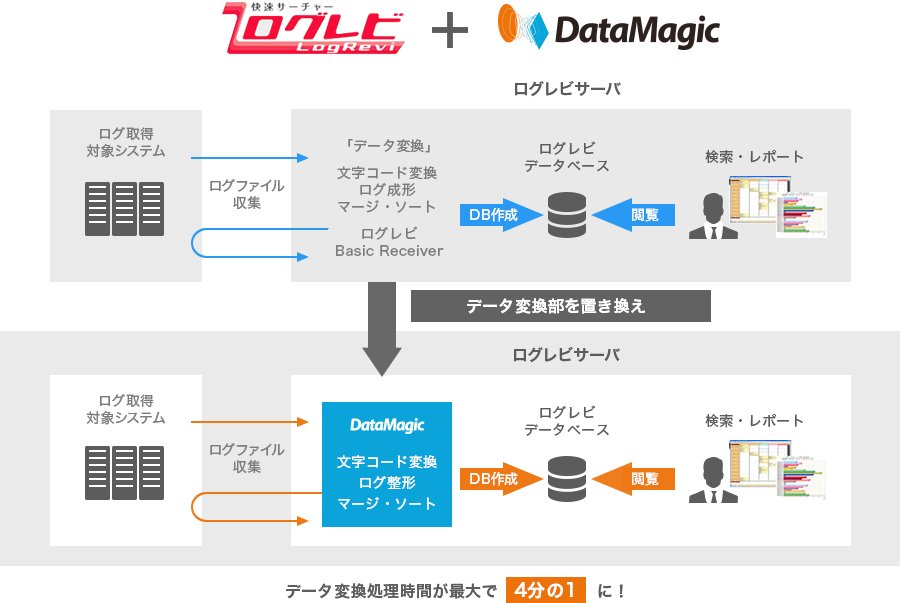 統合ログ管理ソフトウェア「快速サーチャーLogRevi」が収集した大容量ログのデータ変換処理をDataMagicを組み合わせることにより、最大でデータ変換処理時間が4分の1に!