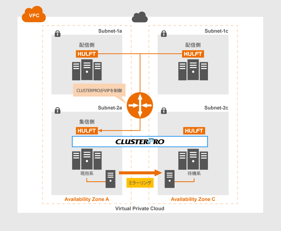 HAクラスタリングソフトウェアである「CLUSTERPRO」と「HULFT」を組み合わせ、HULFTをMulti-AZ構成で冗長化することで、AZ障害への対応が可能になります。