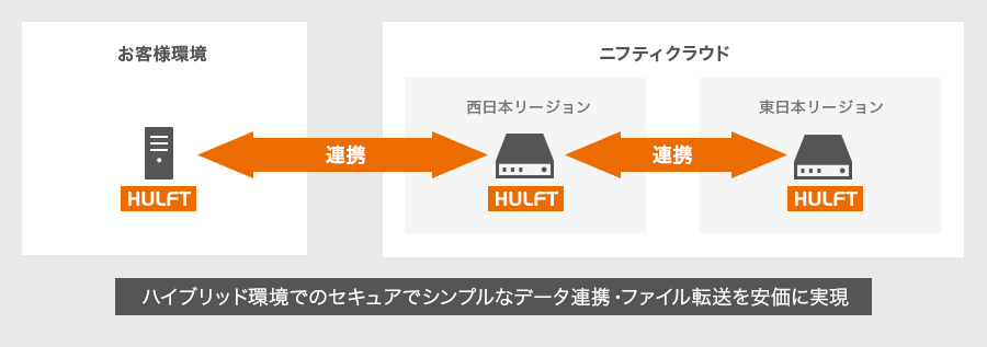 「HULFT for ニフティクラウド」は、「HULFT」の各種機能を、『ニフティクラウド』上で月額料金にて利用できるサービスです。オンプレミス環境と『ニフティクラウド』を組み合わせたハイブリッド環境などの複雑なシステム環境においても、シームレスでセキュアなデータ連携/ファイル転送を容易に実現できます。