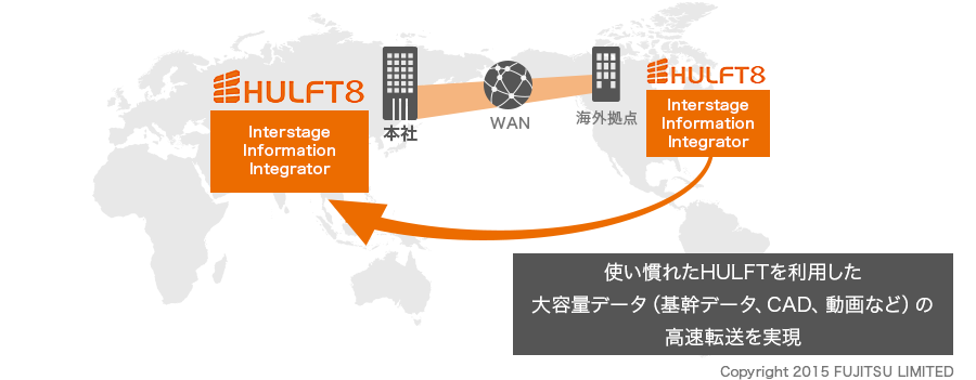 HULFT8を使用したファイル転送システムにInterstage Information Integratorの転送アクセラレーター機能をアドオンすることで、遠隔地へのファイル転送を高速化できます。特に、転送データ量が多くなりがちな基幹データや圧縮率が低いデータ(CADファイル、動画など)を、海外拠点などの遠隔地へ配信する場合に本連携が効果を発揮します。大容量データが高速転送できるため、グローバルビジネスにおける情報共有だけでなくデータ利活用の幅も広げることができます。
