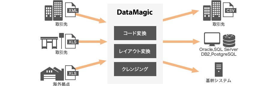 DataMagicは、幅広いコード体系に対応しています。ユーザ定義の外字やEBCDICコードへの変換、Unicode変換時に問題となるWindows固有文字(~∥-¢£¬)にも完全対応(2011年1月末現在)。またCSV、XMLのデータ形式はもちろん、階層フォーマットを使用する事で全銀・CIIなどの標準フォーマットの変換も可能です。日付データの和暦・西暦変換を含む日付演算、桁区切り・通貨記号を含む数字文字列の演算を行うことができるようになり、DB連携を含め多彩な変換が可能です。