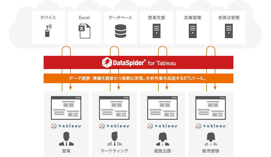 DataSpider for Tableauは素早く簡単かつローコストで分析用データの作成・準備ができるアナリストのためのETLツールです。分析の前準備で手間のかかる複数データのマージやデータのクレンジング、計算、加工。これらの作業をDataSpiderを使うことで自動化でき手作業をなくすことができます。データの収集からTableau形式のTDEファイルの作成、Tableauサーバーへの登録までサポート。前準備の手間をなくし、分析に集中することを可能にします。