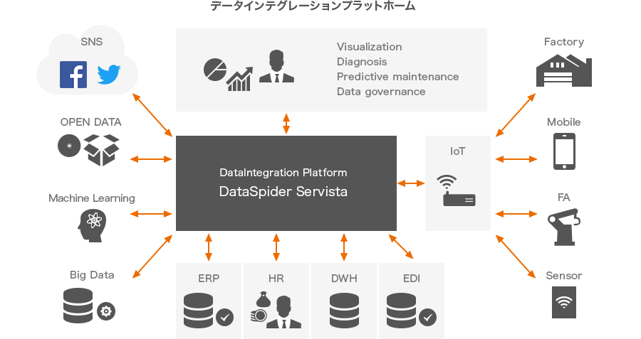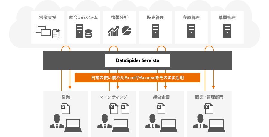 DataSpider Servistaは、企業内外の様々なシステムで用いられている、フォーマットの異なる膨大な量のデータを「つないで・まとめて・とりだせる」データ連携HUBとして機能します。