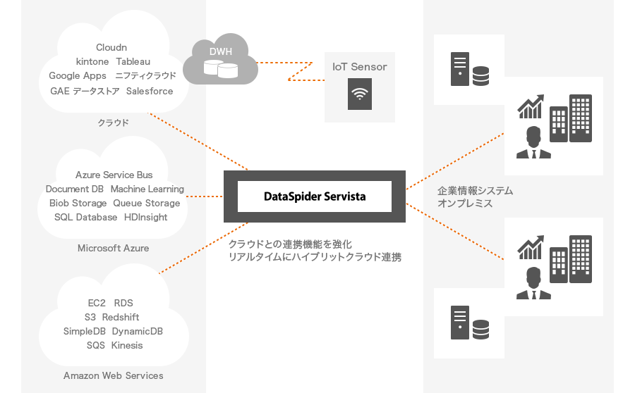 オンプレミスとの連携、オンプレミスからクラウドへの移行、さらには複数のパブリッククラウドを組み合わせて利用する「ハイブリッドクラウド」の取り組みも DataSpider Servista のクラウド連携機能で実現できます。