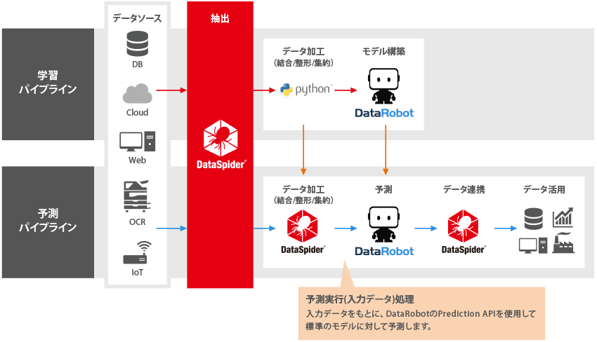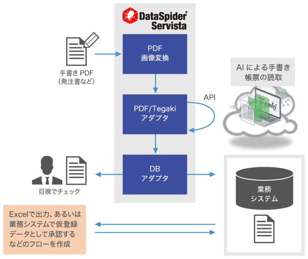 TegakiはAI(ディープラーニング)を利用したOCR手書き読み取りを可能にするサービスです。DataSpiderでTegakiアダプタを利用する場合には、手書きデータをTegaki OCRで読み込み可能な画像ファイルへ変換、Tegakiによりデジタルデータとして読み込まれた変換したデータをAPIにてDataSpiderに取得、読み取りしたデータを業務システムに合わせ加工し、人による読み取り結果の確認・承認した後、DB等に登録する等のワークフローを業務に合わせて開発することが可能です。
