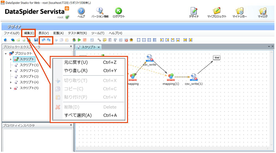 DataSpiderの運用環境(DataSpiderServer)が遠隔地にある場合に利用する開発・運用のクライアントソフトウェア「Studio for Web」を機能強化しました。以下の項目について「DataSpider Studio for Desktop」との機能差分を解消しています。