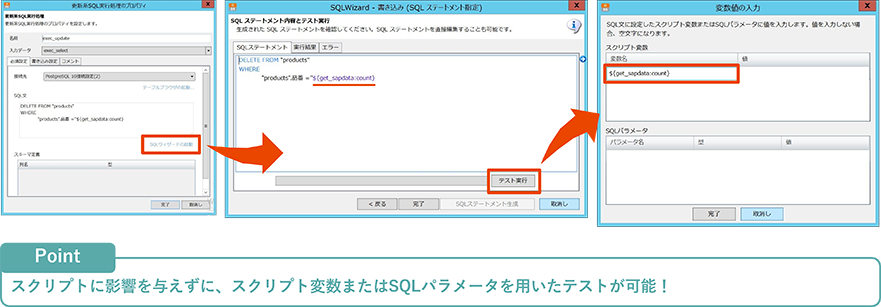 「SQL ステートメント内容とテスト実行」画面で、[SQL ステートメント] にスクリプト変数またはSQLパラメータが含まれる場合、[テスト実行] 時にスクリプト変数または SQL パラメータへテスト用の値を「変数値の入力」ダイアログで設定できるようになりました。