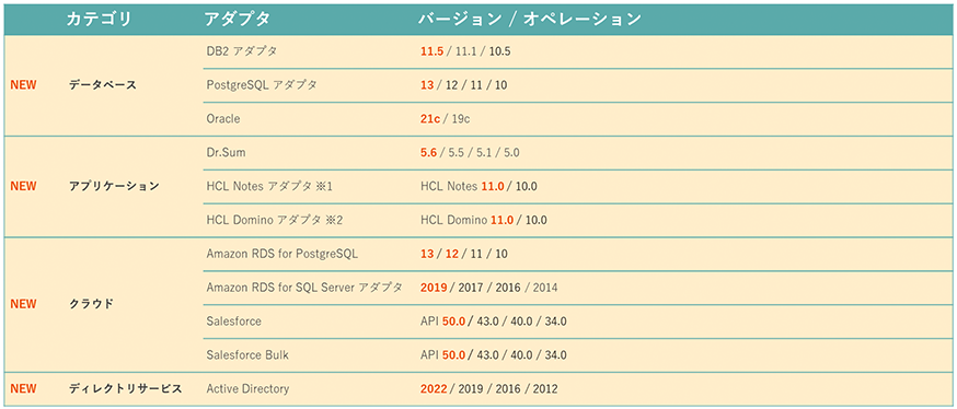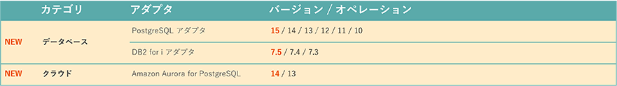 カテゴリ | アダプタ | バージョン / オペレーション |