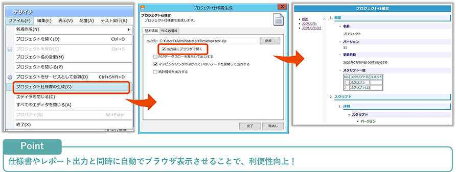プロジェクト/スクリプト仕様書の生成およびバージョン比較レポートの出力で、出力後に仕様書を自動的にウェブブラウザで開くかどうかを選択できるようになりました。