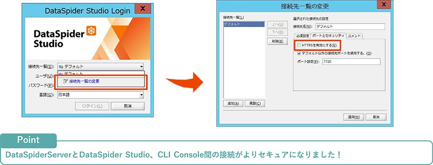 DataSpider Studio および Client CLI Console で、DataSpiderServer とのHTTPS接続が可能になりました。