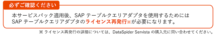 SAP テーブルクエリアダプタを使用している場合は、必ず本サービスパックを適用して内部バージョン「3.0.3」にアップグレードしてください。 DataSpider Servista 4.4 SP2 がサポートする SAP テーブルクエリアダプタは、内部バージョン「3.0.3」のみとなります。