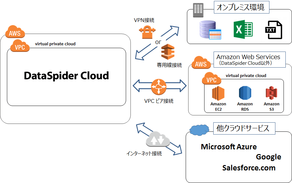 VPNや専用線を敷設する場合は、DataSpider Cloud側の設定費を別途申し受けます。詳細は販売代理店営業または弊社営業までご連絡ください。