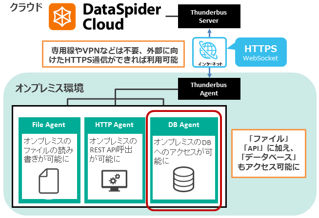 新たに、クラウド側からオンプレミス側データベースへの直接アクセスを可能にする新機能(Thunderbus DB Agent)を追加しました。