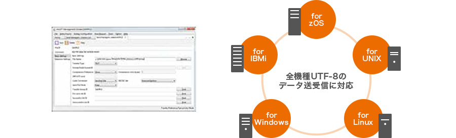 HULFT7ではUNIXとLinuxのみだったUTF-8ファイルの送受信がHULFT8から全機種対応。zOS,IBMi、Windowsとのファイル転送においても別途コード変換処理を行うシステムの準備なしに、円滑なファイル転送が可能です。その結果、HULFTのメッセージやコメント、ファイル名がOSのシステムロケールと同じ言語で利用できます。