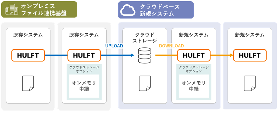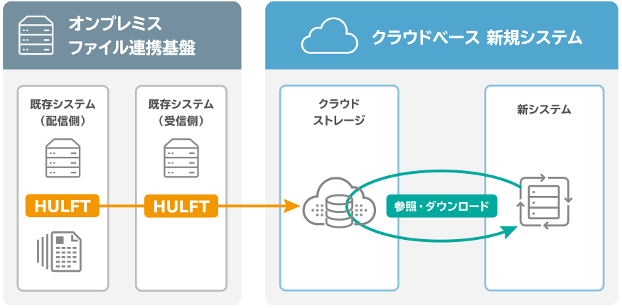 オンプレミス側にある既存システムのHULFT運用はそのままに、クラウドストレージオプションを利用することで、クラウド上の新システムとのデータ連携が可能になります。