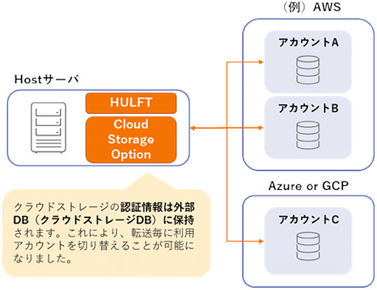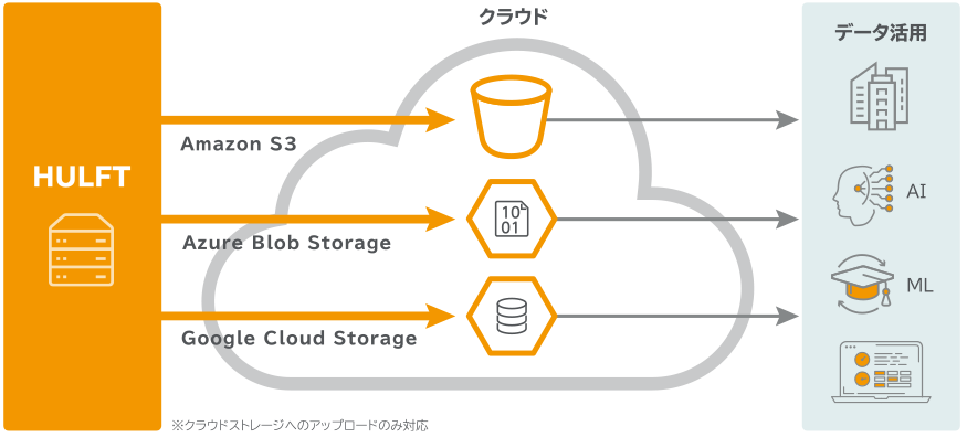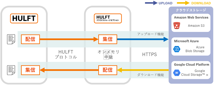 HULFTクラウドストレージオプションは、クラウドサービス上のオブジェクトストレージに直接ファイル転送を行うためのHULFTのオプション製品です。従来の使い慣れたHULFTの設定作業や運用方法はそのままに、HULFTの連携先として「Amazon S3」や「Azure Blob Storage」、「Google Cloud Storage」へのファイル転送を実現します。