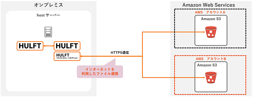 HULFTをクラウド環境上で運用しているケースはもちろん、基幹系システムはオンプレミスで運用、情報系システムはクラウドで運用しているようなハイブリッド環境でも、オンプレミス側からクラウドストレージに直接ファイル転送が可能です。