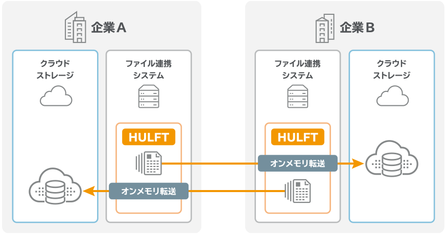 取引先からはHULFT転送を利用して、ファイルを受領。HULFTクラウドストレージオプションを利用することで中継サーバにはファイルを残さず、オンメモリ転送でのアップロードが可能です。