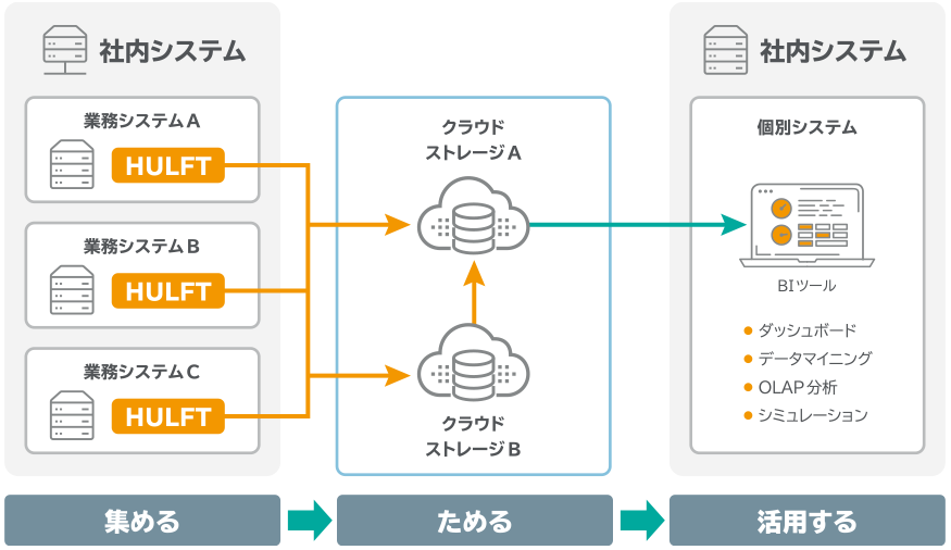 社内システムのファイル転送にHULFTをお使いであれば、HULFTクラウドストレージオプションを追加いただくことで、クラウドストレージ上へデータレイク基盤を構築できます。