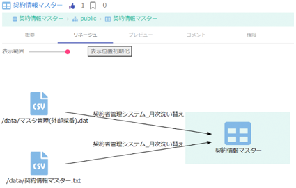 対象データの来歴(ソース, 生い立ち, 連携元)をビジュアルで表示します。