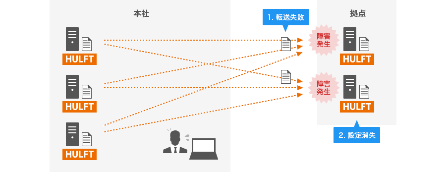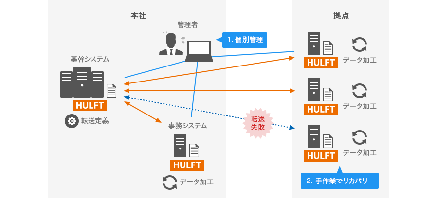 - 障害発生時に転送データを「HULFT-HUB」上に蓄積し、復旧後に速やかに再配信!
