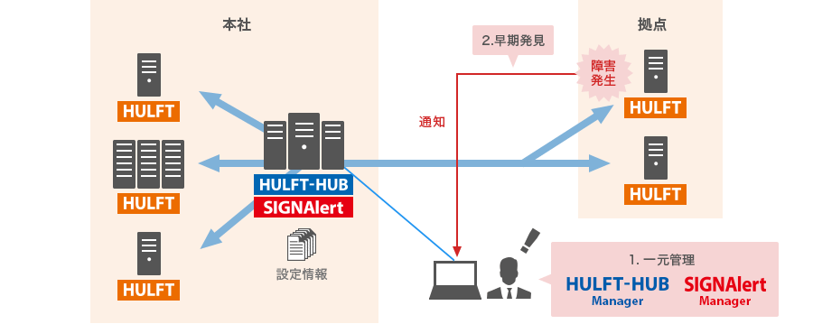 散在する「HULFT」を統合管理することで運用負荷を大きく軽減できます。さらに「HULFT」の状態を監視する「SIGNAlert」※2で 異常を早期に発見、速やかに障害個所を特定することで、データ転送の安全性を高められます。