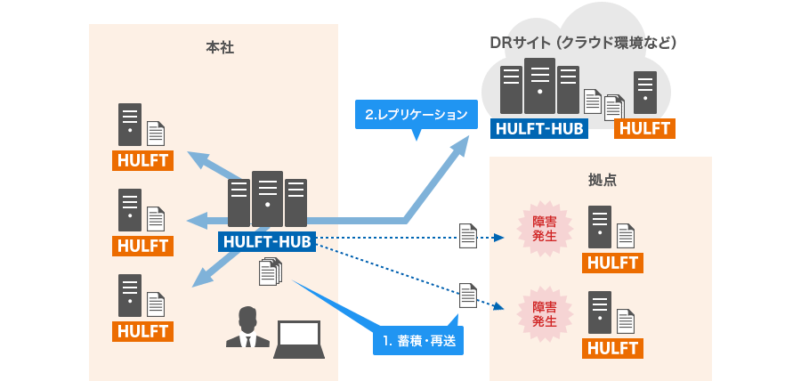 障害発生により拠点の「HULFT」へデータが送れない場合、「HULFT-HUB」の蓄積により、データを保全できます。さらにレプリケーション機能を 用いれば簡易的なDR対策が可能です。集信側処理の失敗などの際の送り直し制御など、通常運用時にも大変役立つ機能です。