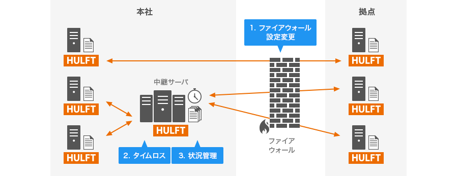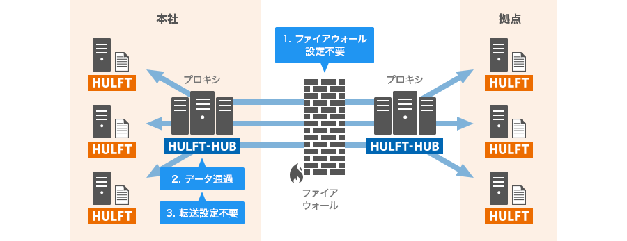 ファイアウォール越しに通信する場合、「HULFT」が増えるたびに設定変更が必要に…。「HULFT-HUB」をプロキシとして使えばファイアウォールや転送中継の設定変更が不要に!中間ファイル生成による処理負荷、時間ロス、情報漏えいリスクまで全て解消します。