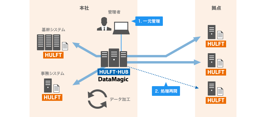拠点ごとに行っているデータ加工を、「HULFT-HUB」と連携する「HULFT-DataMagic」※1にて集約すれば、データ加工処理を 一元管理できるようになり、運用負荷低減が実現。さらに、ジョブフローによる加工処理の自動化で業務効率も向上します。