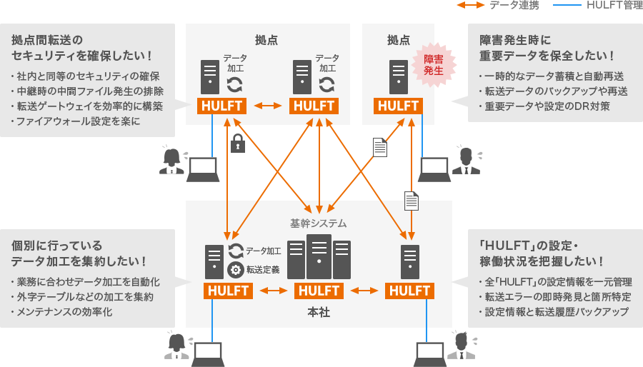 いつの間にか数が増えてしまった「HULFT」の管理・運用でお悩みですか?「HULFT-HUB」を導入することで、「HULFT」間のデータ連携がスマートに変わり、お客様のニーズに合ったデータ連携ソリューションを実現します。