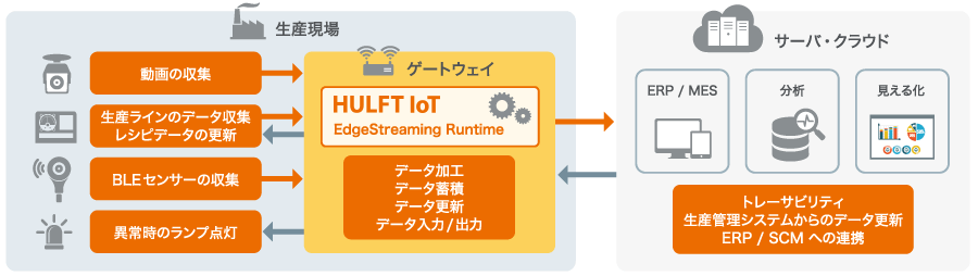 HULFT IoTは生産現場で発生する生産機器などのエッジ層・デバイス層から情報を取得し、サーバ・クラウド等のデータ利用先への連携をノンプログラミングで簡単に構築できるIoTデータ連携ソリューションです。