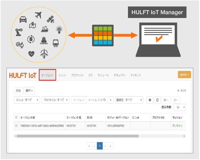 開発不要で管理画面から一元的に、エージェントの設定、状態把握、履歴参照ができます。機器側にプッシュでアップデートモジュールを配布する遠隔アップデートも可能です。